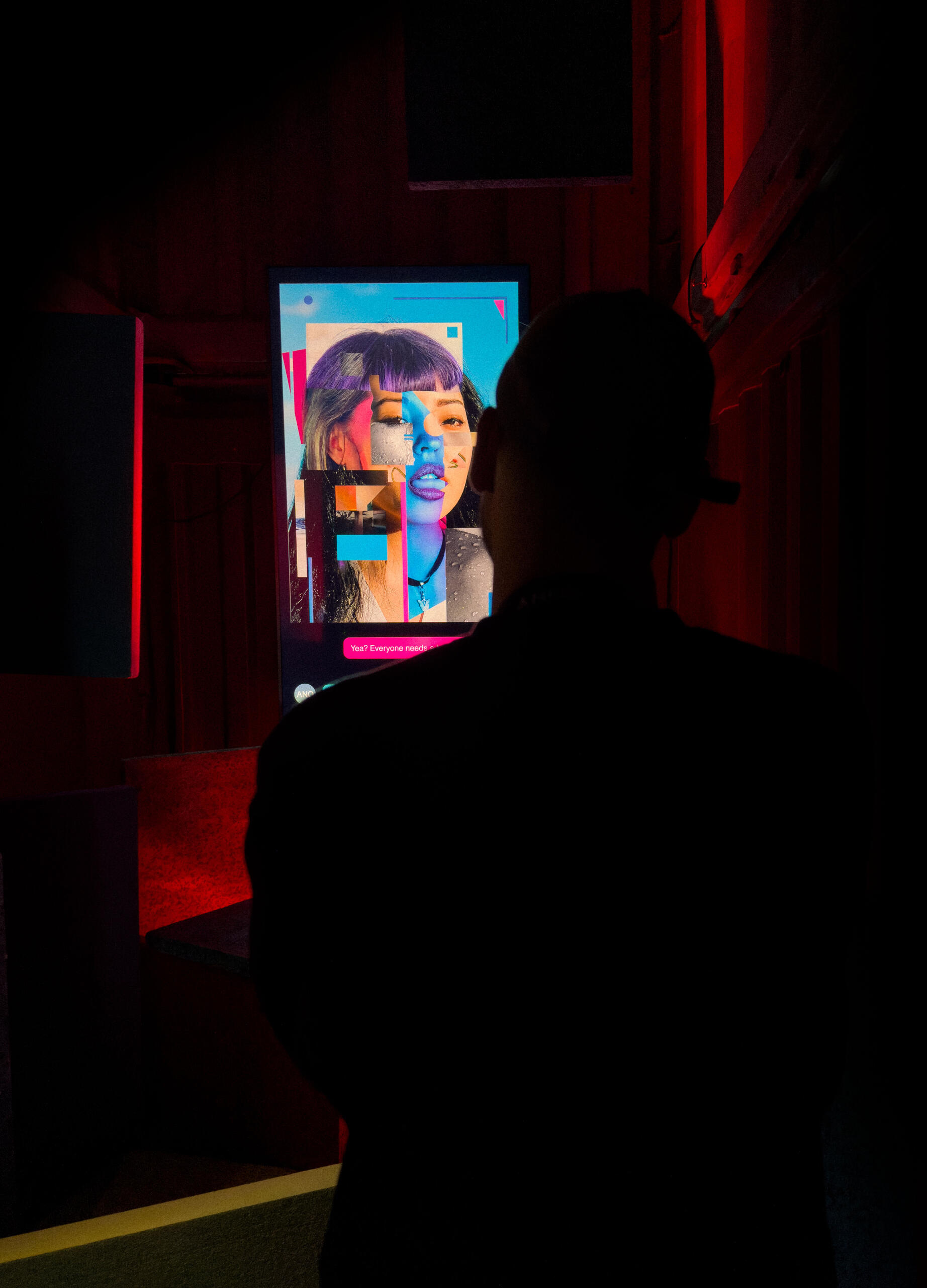 “Lost in the Digital Crowd” is an interactive projection triggered by touch, representing the overload of information we all experience in the digital world. The shape of a phone inspires the form of the fridge. Both products are interconnected with the word “consumption”.The products we decided to use to represent addiction and the dopamine loop are ice-creams. This sweet treat produces a high amount of dopamine in our bodies.